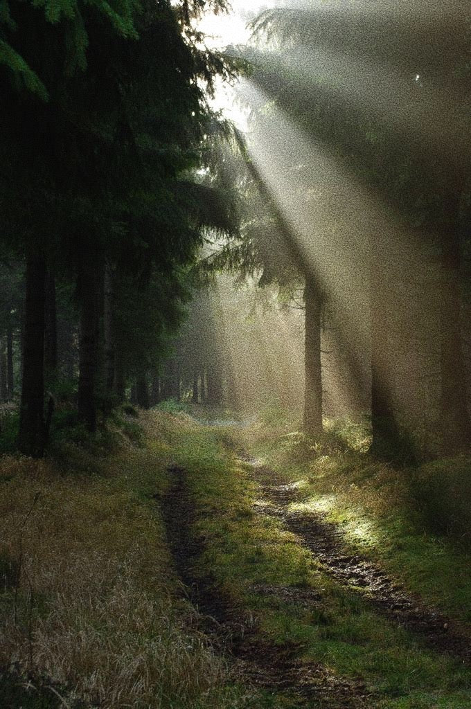 A dense forest full of oak, pine, fir, and cedar trees. I'm surrounded by the tranquil chirps of the birds. A memory of my childhood days in the woods, gathering pinecones and running carefree between the trees. The sun illuminates the space between the trees, reaching gently into the soft moss. A light breeze sweeps through the trees, bringing with it the scent of deep forests. I feel grateful, calm, and energised.